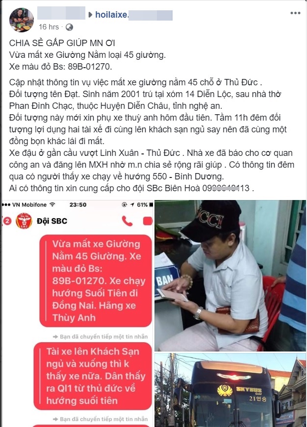 Bài đăng "cầu cứu" của chủ xe trên nhóm hội mong tìm lại được chiếc xe khách của mình