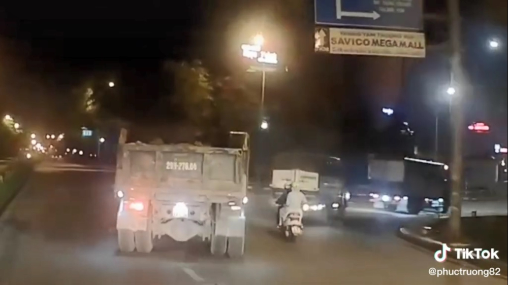 Người điều khiển chiếc xe tay ga đã quyết định cho xe máy lạng lách và tạt đầu xe tải đang quẹo phải, hành động này đã khiến tài xế xe tải phải phanh xe gấp.