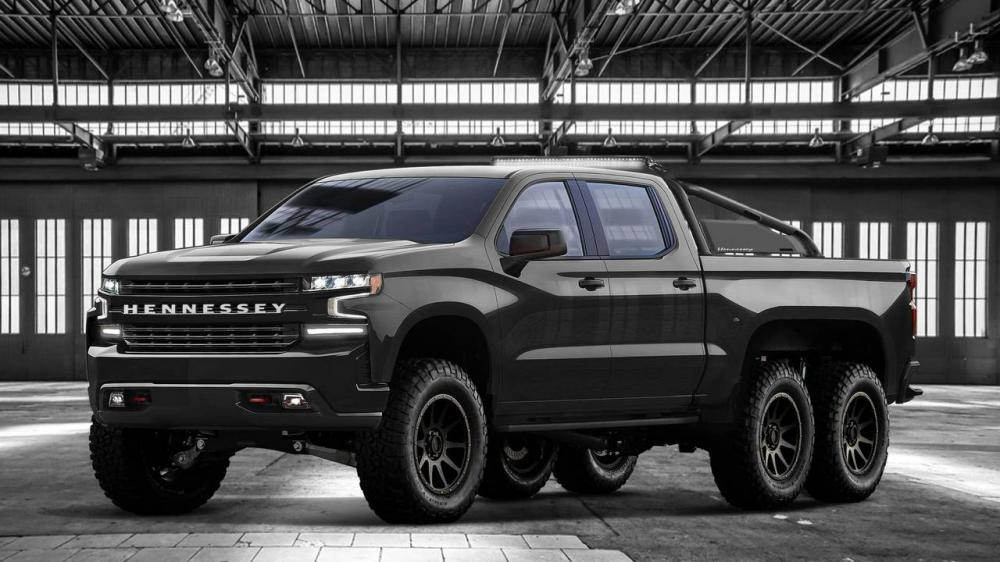 Những người yêu thích một “trái tim mạnh mẽ” ở phía trước chiếc bán tải của họ có thể sẽ rất hài lòng với Hennessey Goliath 6x6, một quái vật 6 bánh, 705 mã lực vốn có tiền thân là một chiếc Chevrolet Silverado. Đội ngũ ở công ty độ xe Hennessey đã bổ sung một số trang bị điên rồ, bao gồm thùng xe kéo dài, bộ nâng 8-inch, lốp xe BF Goodrich 37-inch, và 4 ống xả.