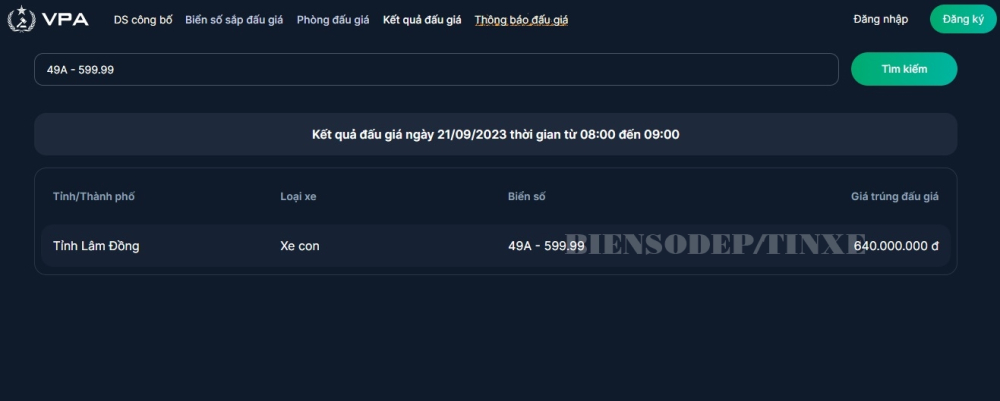Trong đó, vào 8 giờ sáng đến 9 giờ sáng ngày 21 tháng 9 năm 2023, 3 bộ số đẹp đều là tứ quý của 3 tỉnh là Thái Nguyên, Kiên Giang và Lâm Đồng đã được mang ra đấu giá, kết quả thật bất ngờ là biển số 49A-599.99, trúng đấu giá khá thấp, chỉ 640 triệu đồng, so với 2 biển còn lại là 20A-688.88 (Thái Nguyên) giá trúng đấu giá 1,2 tỷ đồng và 68A-299.99 (Kiên Giang) giá trúng đấu giá 2,55 tỷ đồng.