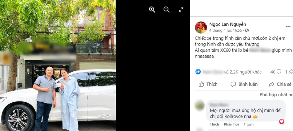 Thông tin chúng tôi tìm hiểu có được, cách đây 10 ngày, tức trước khi nữ diễn viên Ngọc Lan livestream "tố" bảo hiểm nhân thọ, người đẹp này đã có 1 bài đăng muốn tìm chủ mới cho chiếc xe Volvo XC60, tuy nhiên, cô không trực tiếp xử lý việc này mà nhờ 1 người bạn chuyên độ xe bán giúp.
