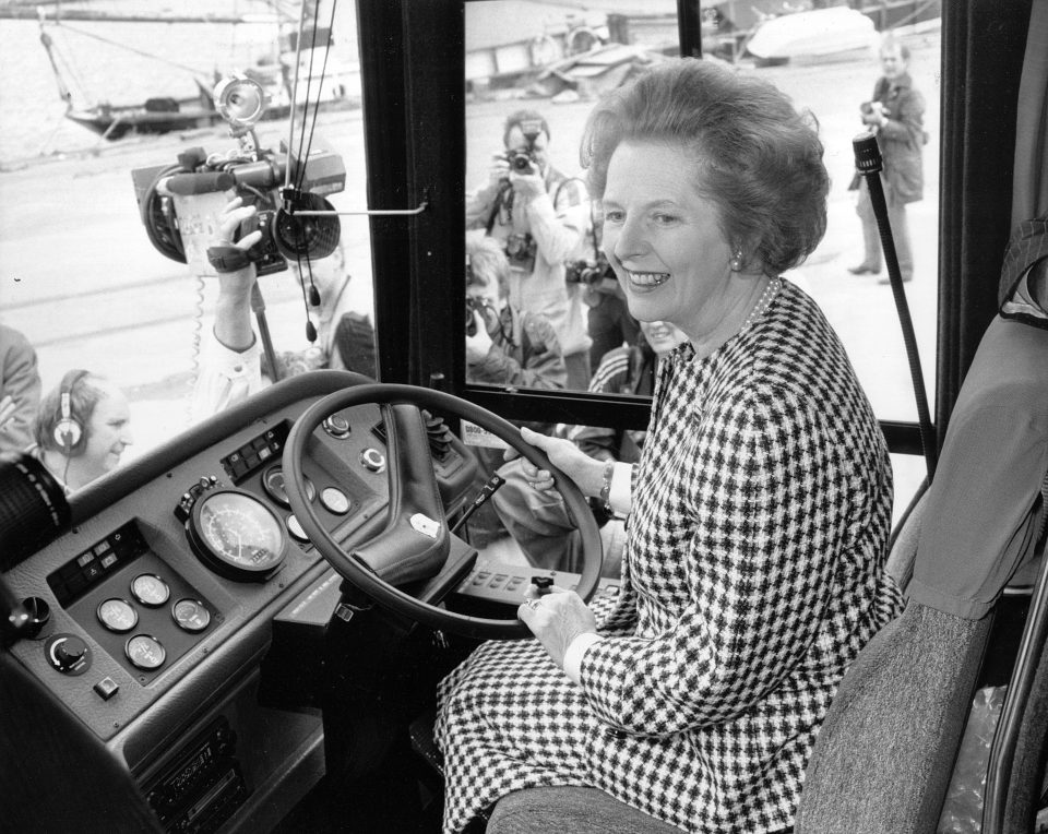 Hình ảnh bà Margaret Thatcher ngồi trong một trong những chiếc xe buýt tranh cử