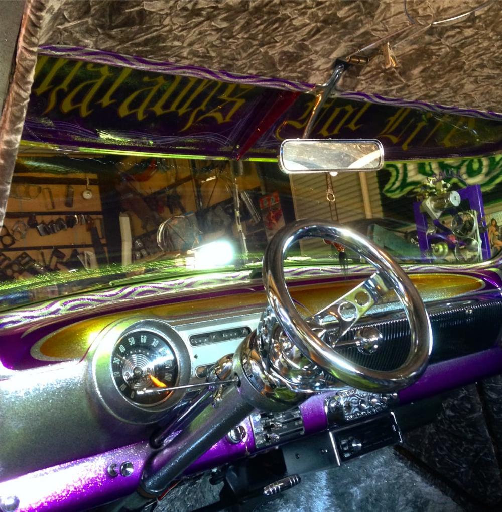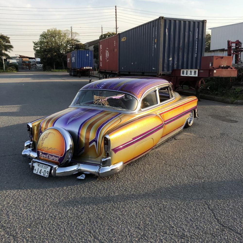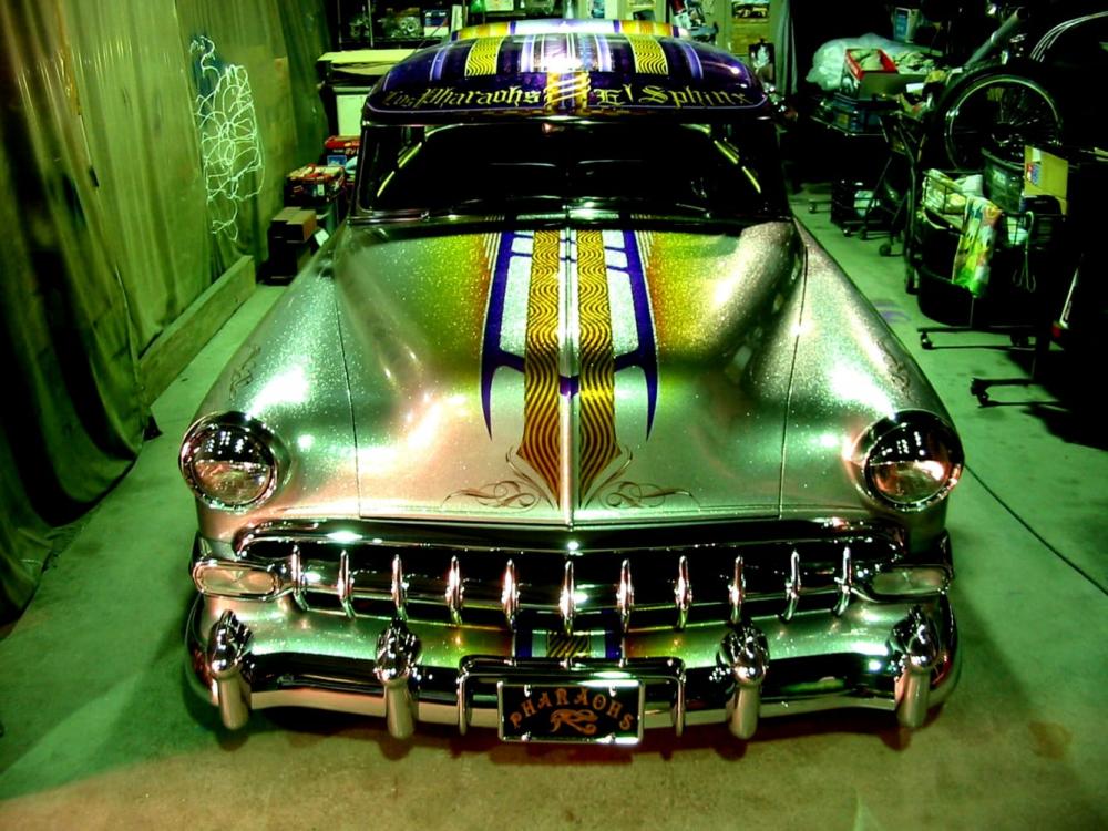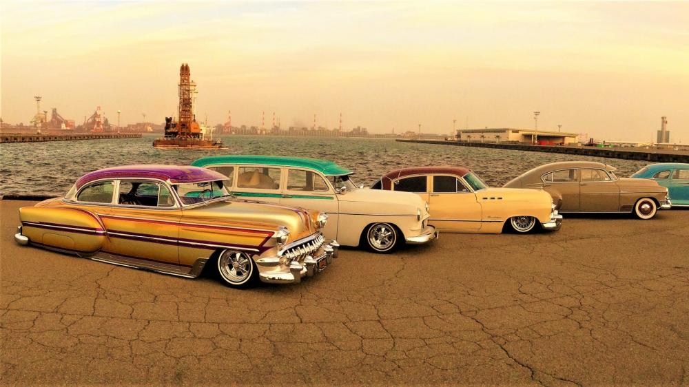 Một chiếc Chevrolet 210 1954 màu vàng được đặt tên là “Sphinx”, đứng cạnh một chiếc sedan Dodge 1936 màu kem xanh lục có tên “Eltesoro”, và “La Vida Rosa”, một chiếc Mercury Monterey 1954 màu hồng sáng, tất cả ba chiếc đều là xe độ thuộc về một trong những câu lạc bộ lowrider lâu đời nhất của Nhật Bản – Pharaohs.