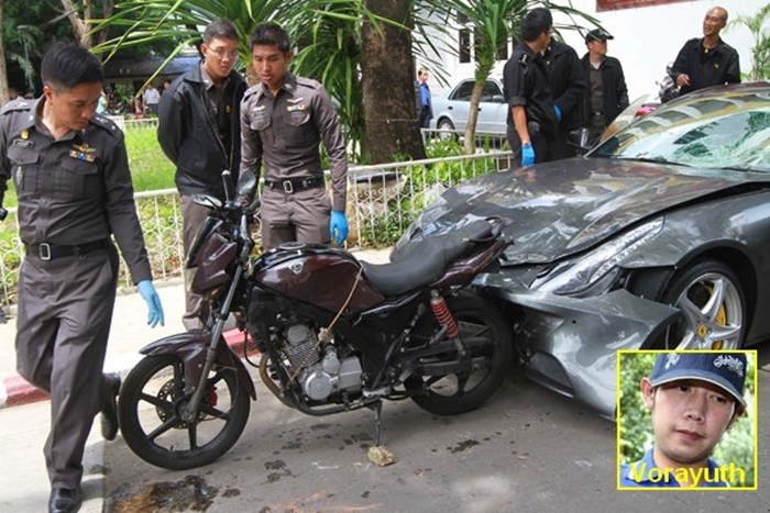 Vorayuth "Boss" Yoovidhya, người thừa kế tập đoàn nước tăng lực Red Bull có tổng tài sản trên 26 tỷ đô la vào năm 2012 được cho là người lái chiếc siêu xe Ferrari GTC4Lusso màu xám tông chết cảnh sát dù gia đình quyền lực nhất nhì ở Thái Lan này cho rằng là người khác lái. Vorayuth sau đó bị truy tố nhiều tội danh bao gồm lái xe quá tốc độ, gây tai nạn bỏ trốn và điều khiển phương tiện bất cẩn gây chết người. Tuy nhiên, vụ việc đã bị gác lại suốt nhiều năm do người thừa kế tỷ phú này liên tục vắng mặt hoặc trì hoãn các cuộc triệu tập của công tố viên.