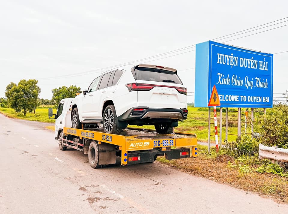 Hình ảnh chụp lại cho thấy, chiếc SUV hạng sang Lexus LX600 thế hệ mới được xe cứu hộ vận chuyển về thị xã Duyên Hải, tỉnh Trà Vinh và nhanh chóng có mặt tại địa điểm làm các thủ tục xét xe.