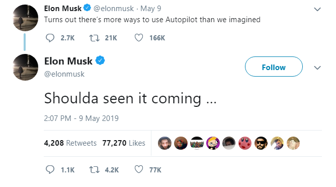 Một ngữ điệu hài hước trong trường hợp này có thể là không thực phù hợp, nhưng chắc hẳn bộ phận PR hoặc luật pháp của Tesla sẽ sớm đưa ra một thông báo có tính cảnh báo chính xác hơn. Hai dòng tweet ở trên thực tế có thể được mang ra làm bằng chứng trước tòa, khi Tesla đang đối diện một đơn kiện liên quan tới một vụ va chạm Model X gây chết người trong năm 2017, nhưng chỉ có thời gian mới nói được.