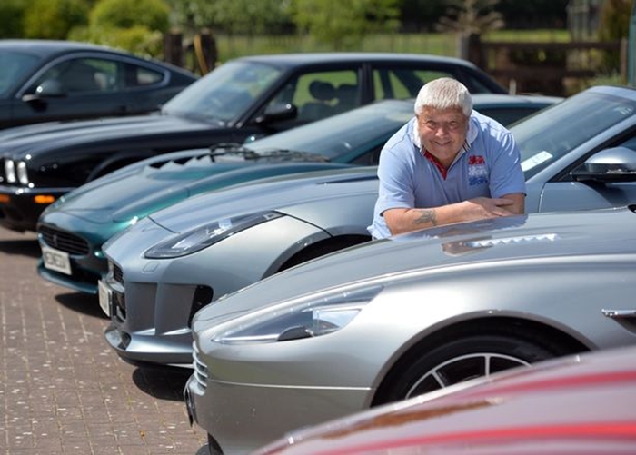 Tom Naylor cùng dàn xe của mình, gần nhất là chiếc Land Rover Discovery màu cam, tiếp theo là 2 xe Aston Martin DB9 với xe màu xám là bản giới hạn, kế bên là 3 chiếc xe đến từ thương hiệu Jaguar bao gồm F-Type mui trần, XJ220 và XJR, sau cùng là Ford Mustang màu đen
