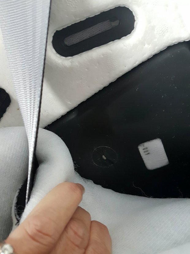 Chị Nichola chỉ vào vị trí cái gai trên ghế ngồi trẻ em Prince của nhà sản xuất Britax