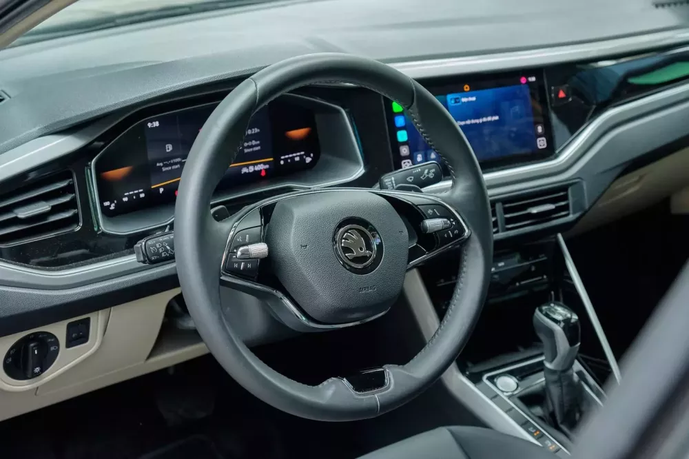 Bước vào bên trong, nội thất của Skoda Slavia đem tới cảm giác khá hiện đại, đặc biệt trên bản Style. Mẫu xe này sở hữu nhiều bộ phận đem lại cảm giác cao cấp hơn các đối thủ Nhật Bản, Hàn Quốc, như vô-lăng hai chấu khá bắt mắt, đi kèm cụm đồng hồ kỹ thuật số 8 inch khá sắc nét có thể xem là điểm cộng.