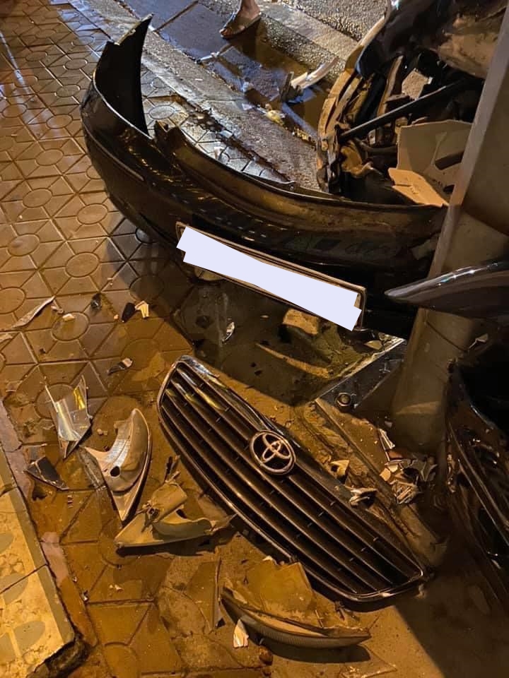 Phần đầu xe Toyota Camry cũng hư hỏng nghiêm trọng, dàn áo xe bể nát nằm rải rác dưới mặt đường và cả trên vỉa hè. Mặt ca-lăng cùng lưới tản nhiệt của chiếc Toyota Camry rơi ra khỏi xe.
