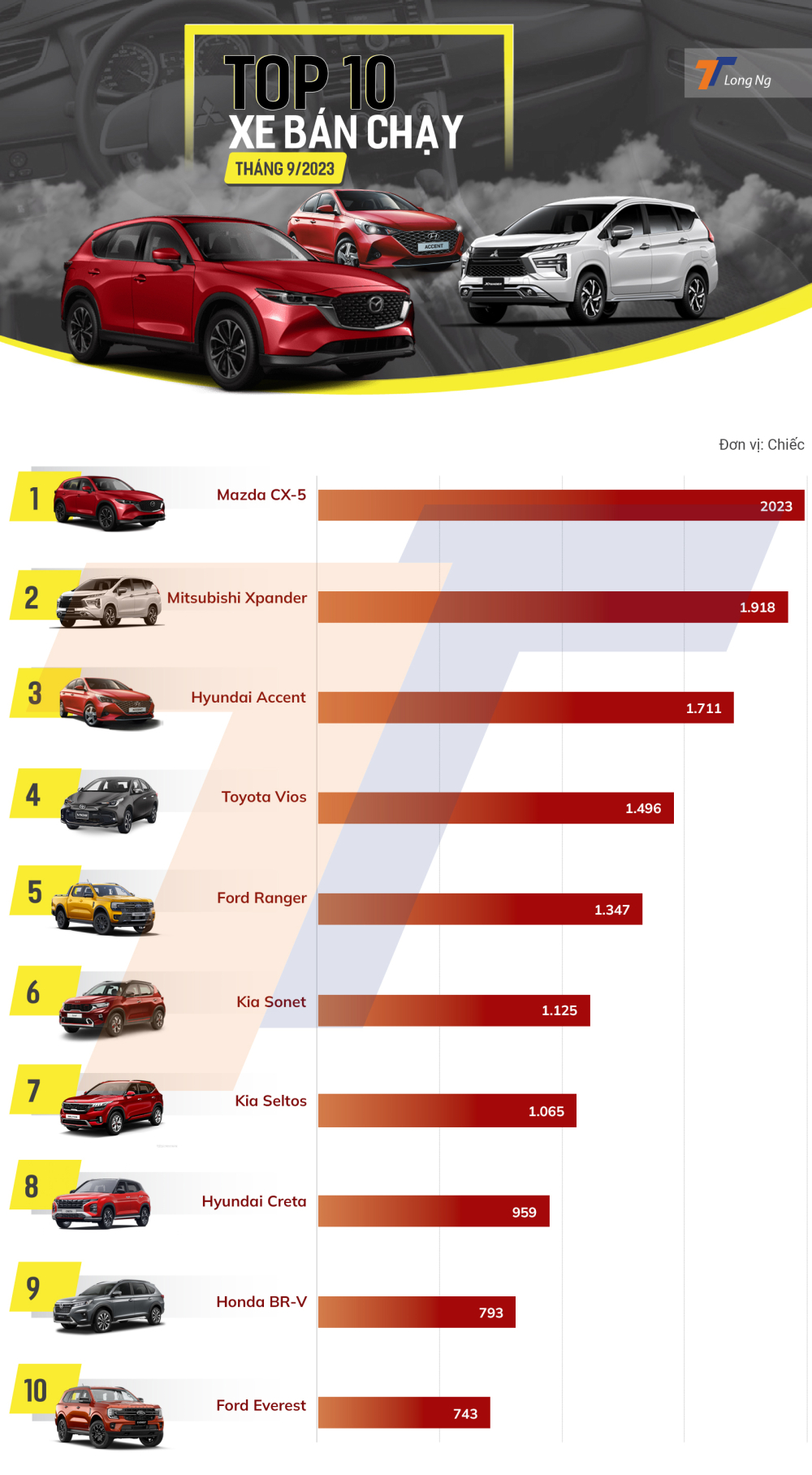 Vị trí số 5 trong top 10 thuộc về Ford Ranger với kết quả bán hàng đạt 1.347 xe, tăng 21% so với tháng 8, giữ vững vị thế thống trị phân khúc xe bán tải.