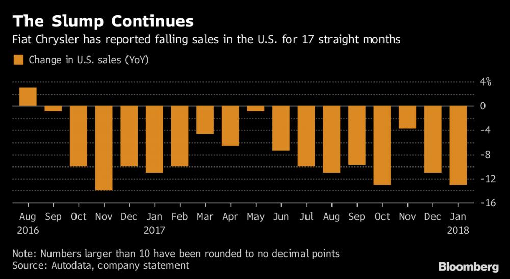 Doanh số tại thị trường Mỹ của Fiat Chrysler đã suy giảm 17 tháng liên tục bởi công ty đã cắt bớt chương trình giảm giá vận chuyển cho nhiều khách hàng "mua sỉ", bao gồm cả các công ty có dịch vụ thuê xe. Họ đã giảm một nửa số xe "bán sỉ" trong tháng 1 vừa qua so với cùng kỳ năm ngoái.