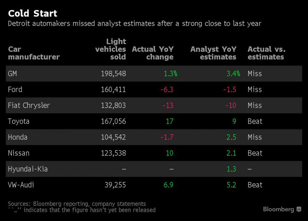 “Đây là một khởi đầu chông gai cho năm nay hơn những gì chúng tôi đã dự đoán,” ông Jeff Schuster, một nhà phân tích ở LMC Automotive, nói. “Sự trả giá có đóng một vai trò ở đây sau một quý IV bùng nổ của năm ngoái và các chương trình kích cầu tăng cao”.