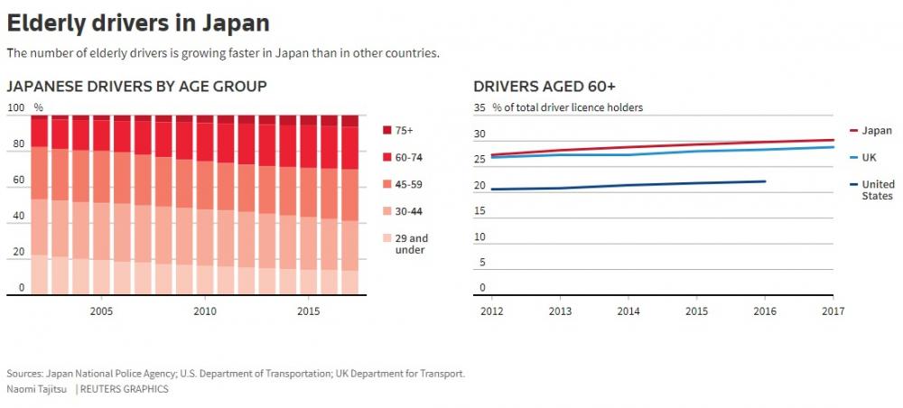Điều đó đã dẫn đến một tình trạng gia tăng tai nạn giao thông liên quan đến tài xế lớn hơn 65 tuổi, kể cả khi tổng số vụ tai nạn đã giảm xuống. Trong năm ngoái, tài xế cao tuổi đã liên quan đến 55% các vụ tai nạn ở Nhật Bản, tăng từ 47% của 10 năm trước.