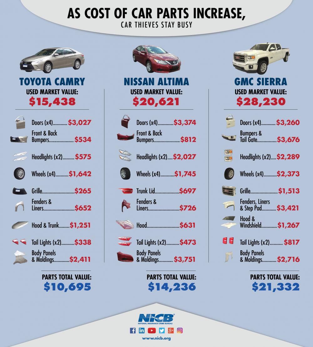 Ba mẫu xe được nhắc đến trong nghiên cứu này bao gồm Toyota Camry, Nissan Altima, và GMC Sierra, tất cả đều thuộc đời 2016. Theo đó, các phụ tùng của Toyota Camry có tổng giá trên 10.000 USD, Nissan Altima là trên 14.000 USD và GMC Sierra là trên 21.000 USD. Đó mới chỉ là số tiền của 15-20 phụ tùng ngoại thất như nắp capô, cửa, đèn pha và la-zăng, hầu hết đều là những món có thể tháo ra một cách dễ dàng.