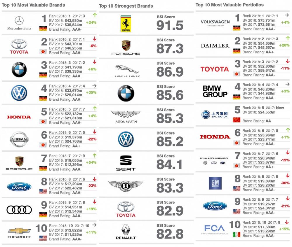 Ở trong cùng một bản báo cáo, Brand Finance có chuẩn bị cả một danh sách top 10 tập đoàn ô tô giá trị nhất thế giới năm 2018, khác biệt với danh sách 10 nhãn hiệu ô tô đơn lẻ có giá trị nhất cao nhất mà Mercedes-Benz dẫn đầu. Không có nhiều bất ngờ khi Volkswagen Group giữ vững ngôi vị thứ 1 với tổng giá trị lên đến 75,6 tỷ USD, tăng trưởng 4% so với năm trước đó. Trong khi đó, tập đoàn Daimler nằm ở vị trí thứ 2 với 54,7 tỷ USD, tăng trưởng 20%.