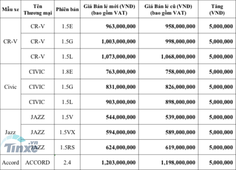 Mới đây, đại diện của Honda Việt Nam đã công bố thông tin hãng này tiến hành tăng giá bán các mẫu xe ô tô nhập khẩu nguyên chiếc từ Thái Lan kể từ ngày 2/4/2018. Mức tăng chung cho các mẫu xe ô tô nhập khẩu như Honda CR-V 7 chỗ, Honda Civic Turbo, Honda Accord, Honda Jazz là 5 triệu VNĐ.