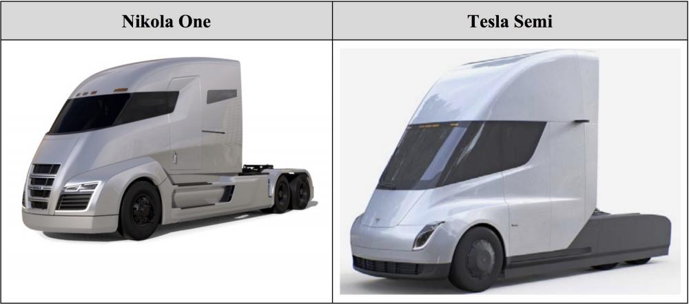 Những lời phàn nàn từ phía Nikola có nêu một số điểm cho thấy Tesla sao chép bằng sáng chế của họ như sự tương đồng giữa One và Semi ở thiết kế tấm chắn bùn trước, kính chắn gió rộng bao quanh buồng lái, cửa vào ở giữa xe, kiểu thân máy bay gia tăng khí động học (với hệ số lực cản tương tự)...