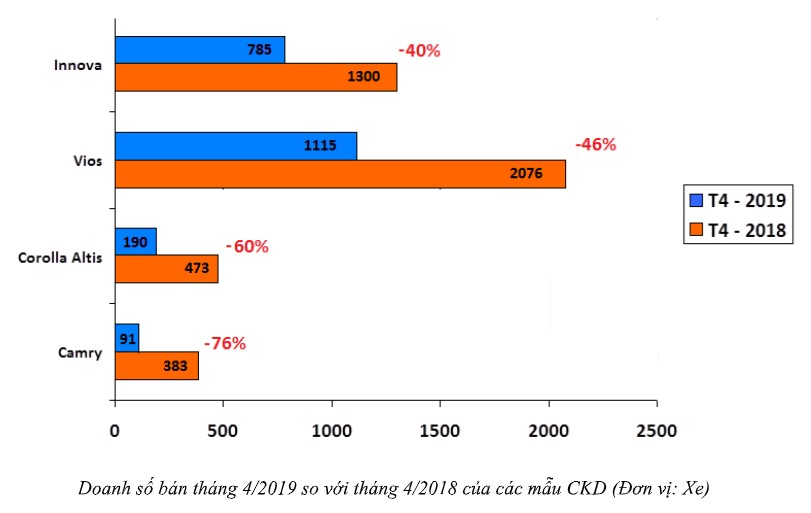 So với tháng 4/2018, doanh số các mẫu xe CKD của Toyota giảm rất mạnh. Cụ thể, doanh số Toyota Vios trong tháng 4 đạt 1.115 xe, giảm 46%. Mẫu MPV Innova có doanh số 785 xe, giảm 40%. Các mẫu xe khác như Corolla Altis, Camry cũng có doanh số giảm, tương tứng với 190 xe và 169 xe, giảm 60 và 76%. Dù doanh số giảm mạnh nhưng Toyota Vios vẫn chiếm đến 42% thị phần xe trong phân khúc.