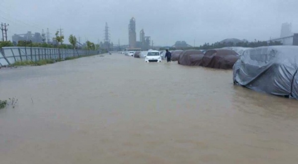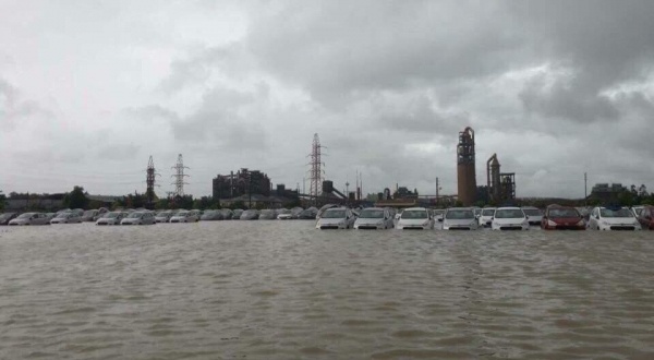 Hình ảnh những chiếc xe Hyundai thành phẩm nằm trong khu chứa phụ bị ngập nước được một số trang báo và mạng xã hội đăng tải.