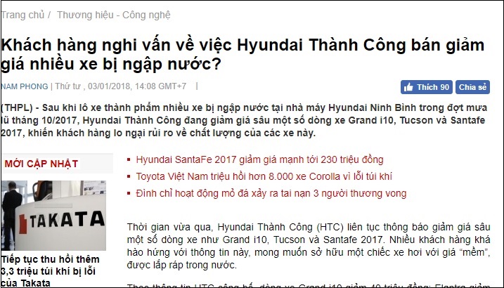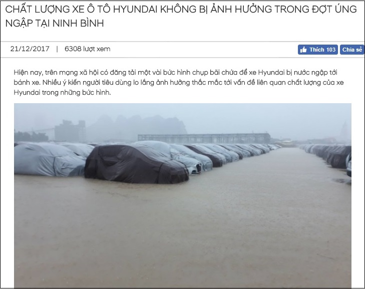 Thông tin khẳng định xe Hyundai không bị ảnh hưởng chất lượng trong đợt ngập úng được đăng lên trang của Hyundai Thành Công vào ngày 21/12/2017. Ảnh chụp màn hình