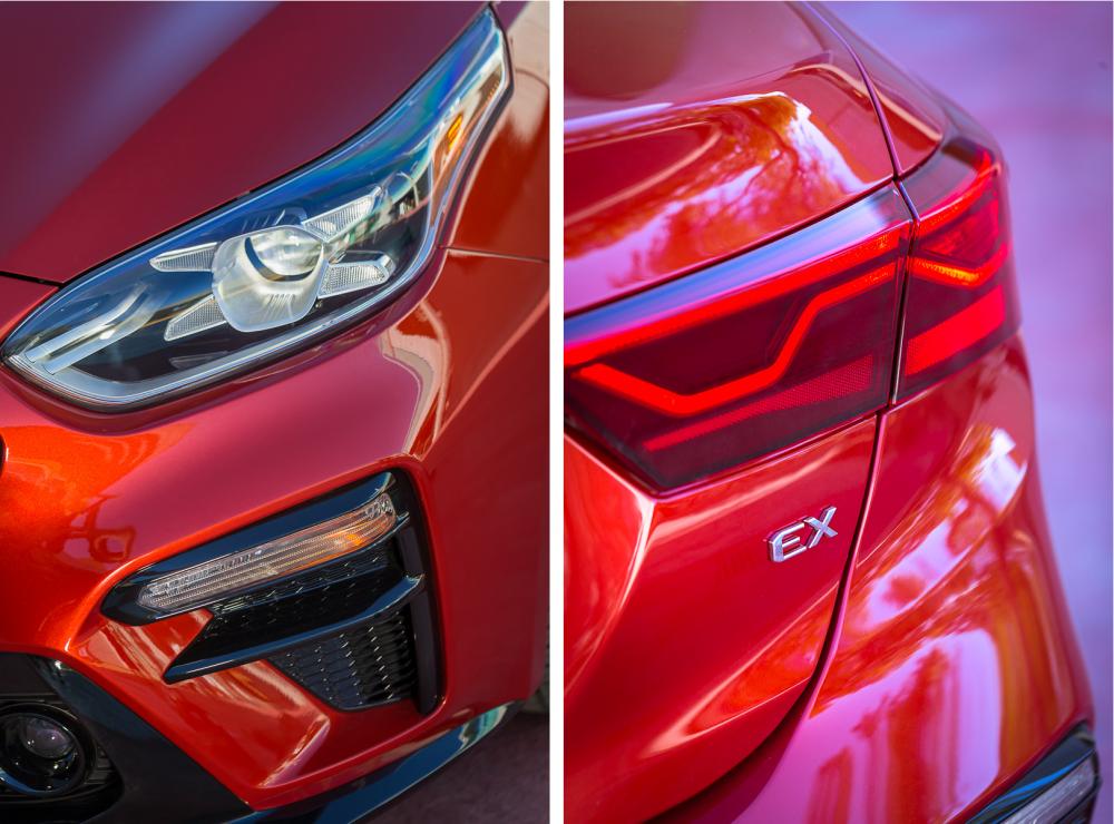 Nói đến phong cách và đường nét thiết kế, Kia Forte 2019 có phần đầu xe khá dài, trong khi đó phần cốp xe khá ngắn. Kiểu thiết kế này tạo cho Forte 2019 dáng dấp của một chiếc fastback tương tự như Stinger. Phần nhựa ốp ở cản sốc của xe được Kia thu gọn lại 5 inch, cụm đèn pha mang thiết kế hoàn toàn mới không giống với mẫu xe nào của hãng, nhưng cụm đèn hậu LED lại khá giống với đèn hậu của mẫu Sportage crossover.