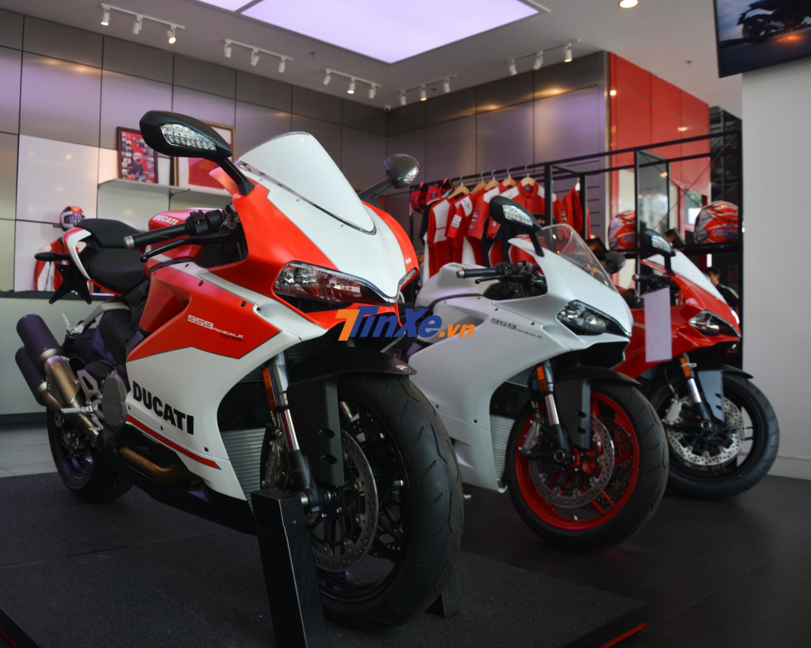 Hai chiếc Ducati 959 Panigale Corse cùng phiên bản tiêu chuẩn Ducati 959 Panigale mang màu đỏ và trắng bóng