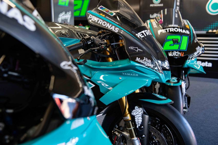 Yamaha R1 Petronas Replica đứng giữa hai chiếc Yamaha YZR-M1 của đội đua Petronas SRT Yamaha