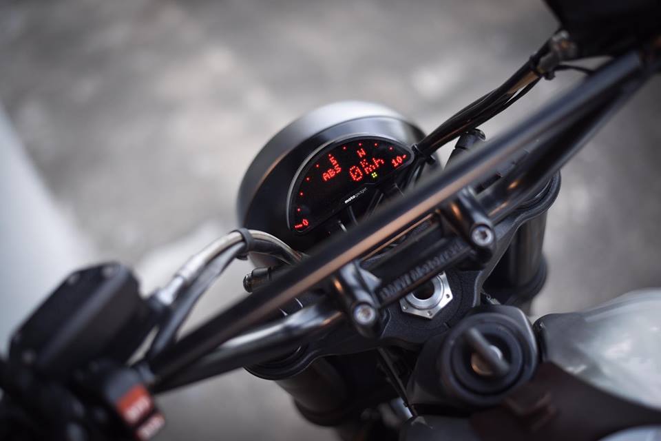 Bộ đồng hồ cồng kềnh được thay thế bằng đồng hồ LED điện tử đơn giản của Motorgadget nhưng vẫn đầy đủ chức năng đặt chính giữa chảng ba.