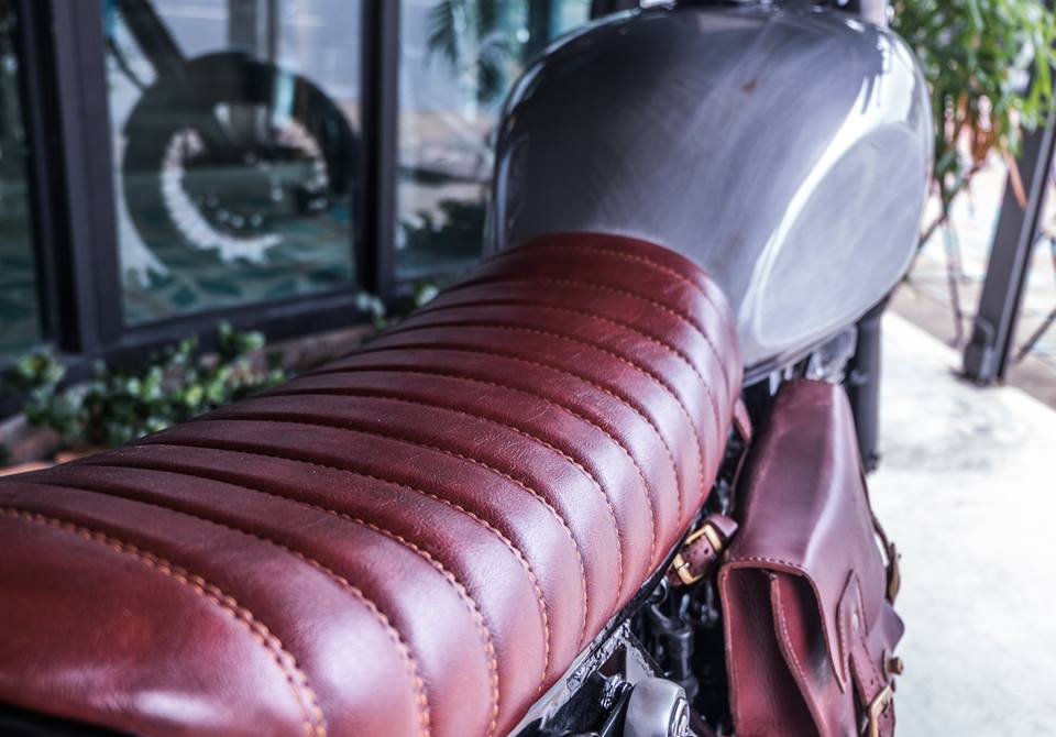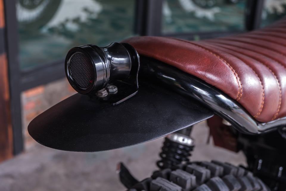 Phía sau, bản độ được trang bị yên xe dài dạng bánh mỳ được thuộc da thủ công làm tăng độ bám, độ êm ái của yên xe cùng bộ màu da bò đậm chất cổ điển, cùng tông với túi da treo hông bụi bặm.