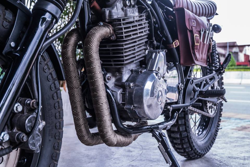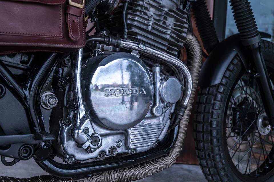 Bộ máy của CB400ss được giữ nguyên, cặp cổ pô đi gọn gàng theo khung và máy được bọc vải cuốn amiang màu đồng giúp cách nhiệt và tăng vẻ bụi bặm cho chiếc xe.