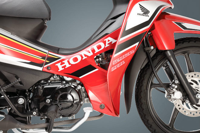 Xe có bộ tem với màu đỏ chủ đạo, xen vào đó là sọc đen trắng, logo Honda được thiết kế lớn.