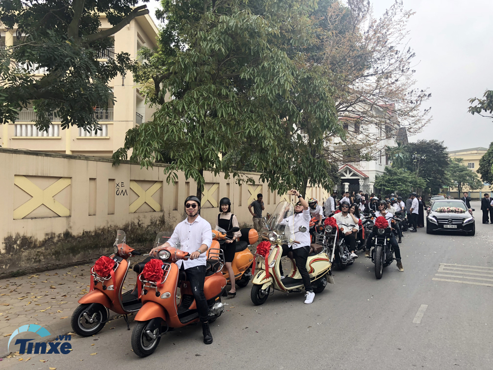 Bốn chiếc xe Vespa nhẹ nhàng nhưng lại là điểm nhấn của dàn xe đón dâu ngày 1/4/2018.