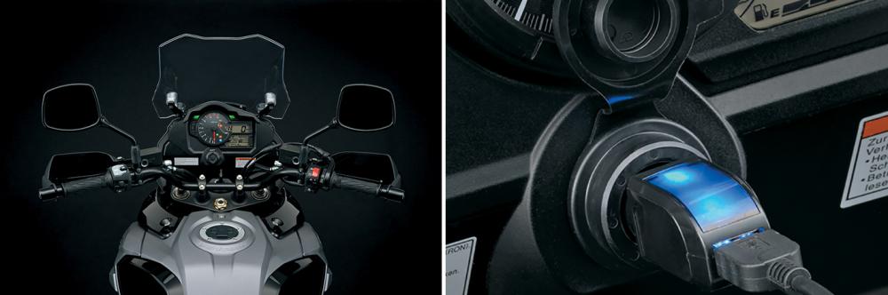 Bảng đồng hồ của xe là sự kết hợp giữa đồng hồ analog thể hiện vòng tua máy và màn hình kỹ thuật số hiển thị các thông số khác như thời gian, vận tốc, cấp số, mức nhiên liệu, nhiệt độ máy, ODO và chế độ kiểm soát lực kéo chống trượt. Ngay phía dưới đồng hồ là cổng sạc 12V, có chức năng cung cấp điện cho thiết bị định vị dẫn đường GPS và điện thoại