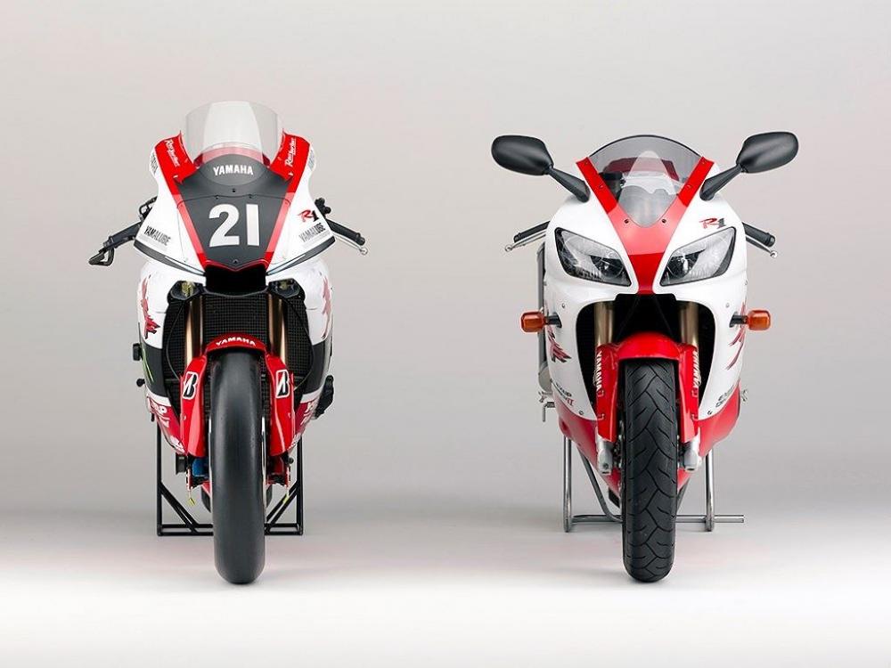 Hình ảnh 2 chiếc xe Yamaha R1 2018 (Trái) và Yamaha R1 1998 (Phải) có sự thay đổi rõ rệt.