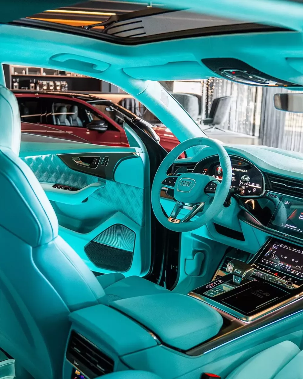 Bộ mâm xe hình chữ Y, sử dụng lốp Hankook Ventus Evo, được trang trí bằng logo của ABT Sportsline , và chúng ta cũng có thể thấy một số điểm nhấn màu xanh bạc hà rất bắt mắt ở ngoại thất, bao gồm cả trên kẹp phanh mang thương hiệu ABT. Ngoài ra, chiếc Audi RS Q8 độ này còn có một số điểm nhấn màu đen bóng và các chi tiết mạ crôm quen thuộc cũng như khoang lái sử dụng tông màu xanh bạc hà mát mắt.