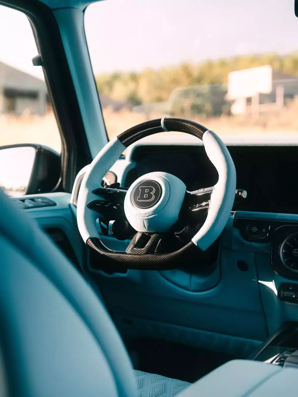 Bậc lên xuống chỉnh điện có đèn chiếu sáng cũng được trang bị, và để dễ dàng ra vào hơn, cửa sau đã được điều chỉnh để mở tối đa 90 độ. Khi bước vào bên trong, bạn sẽ thấy lớp bọc ghế hoàn toàn mới, trông cực kỳ sang trọng như trong hình, được chia sẻ trên các trang mạng xã hội của hãng độ cách đây không lâu. Lớp bọc da màu xanh mòng két kết hợp với một số chi tiết trang trí bằng sợi carbon và logo Brabus trang trí nhiều chi tiết khác nhau bên trong, và không chỉ vậy.