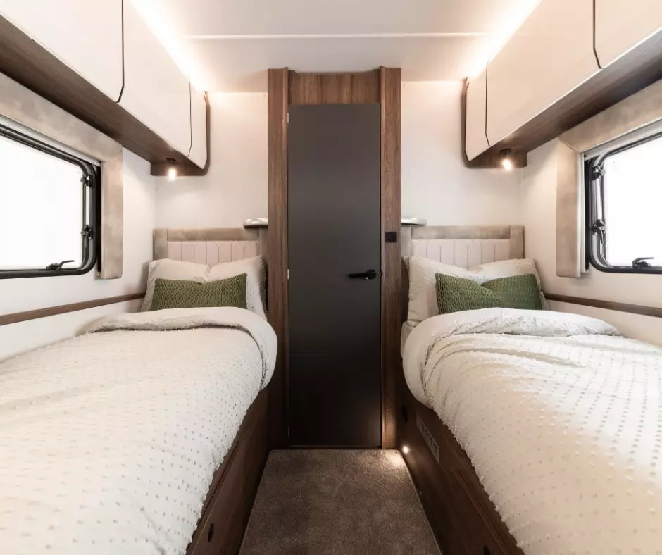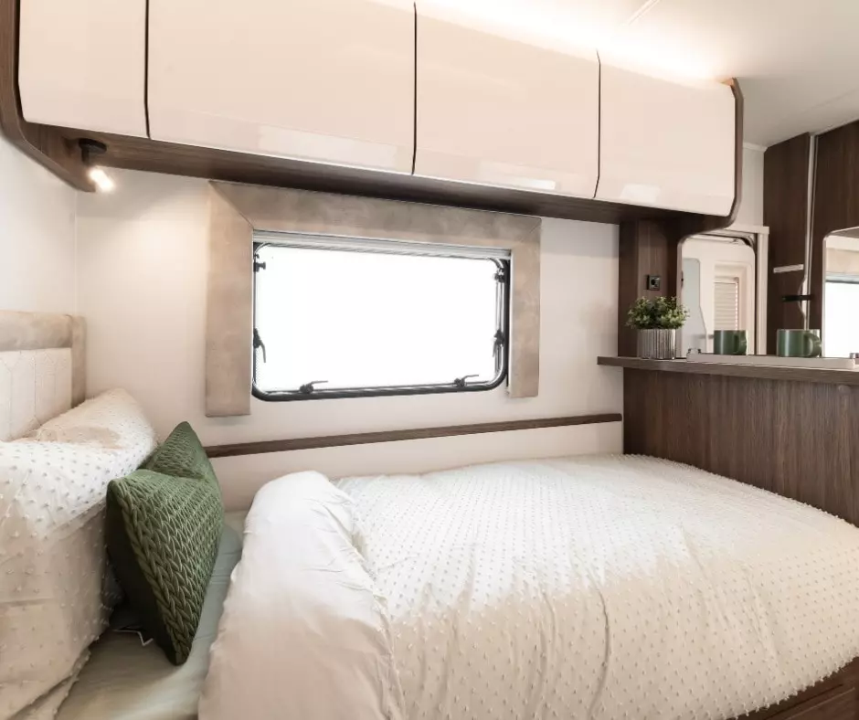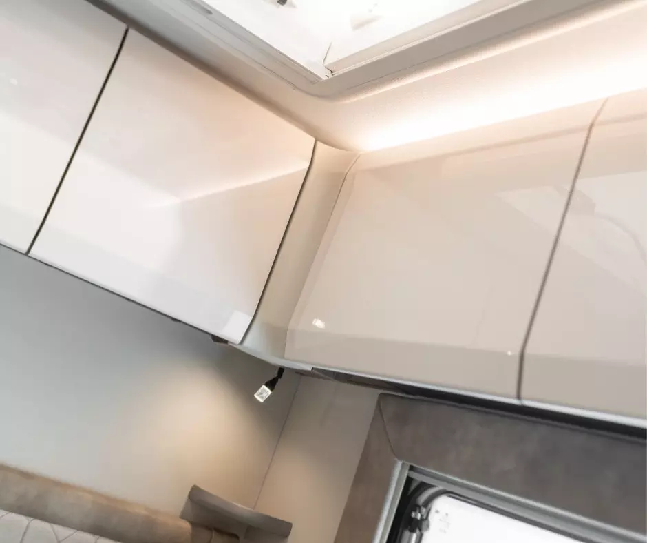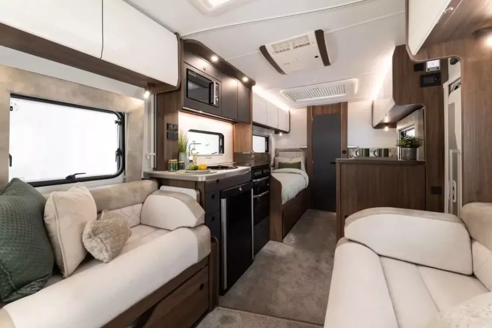 Ngay khi bước vào, bạn sẽ lập tức cảm nhận được sự sang trọng. Nội thất cao cấp mang đến sự cân bằng giữa sang trọng và tiện nghi với đồ nội thất bằng gỗ sồi Narbonne bóng bẩy, bọc ghế chần bông, hệ thống chiếu sáng tạo không gian ấm cúng, hệ thống sưởi Alde bằng gas/điện có thể lập trình và điều hòa không khí tiêu chuẩn.