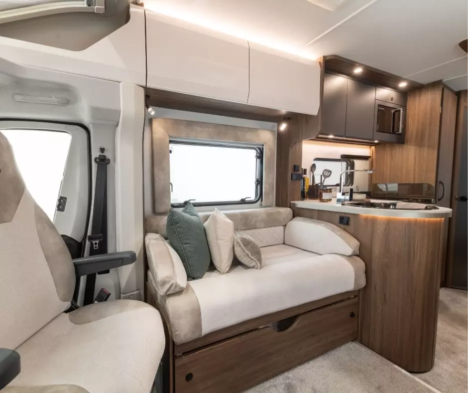 Di chuyển về phía trước của xe nhà di động, các ghế sofa hướng vào trong có tích hợp ghế ngồi du lịch Aguti có thể gập lại, cho phép cả hai mẫu xe hoạt động như xe bốn chỗ thực thụ.
