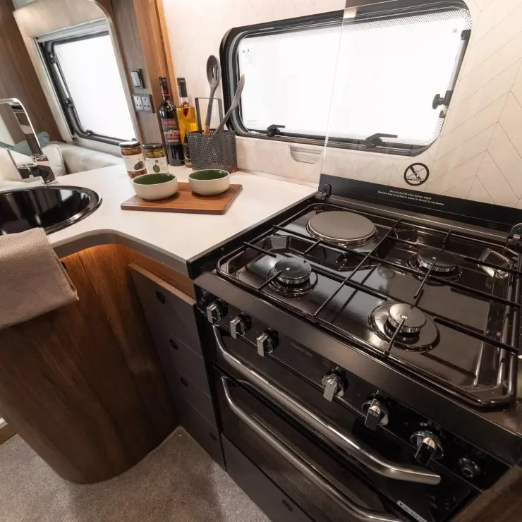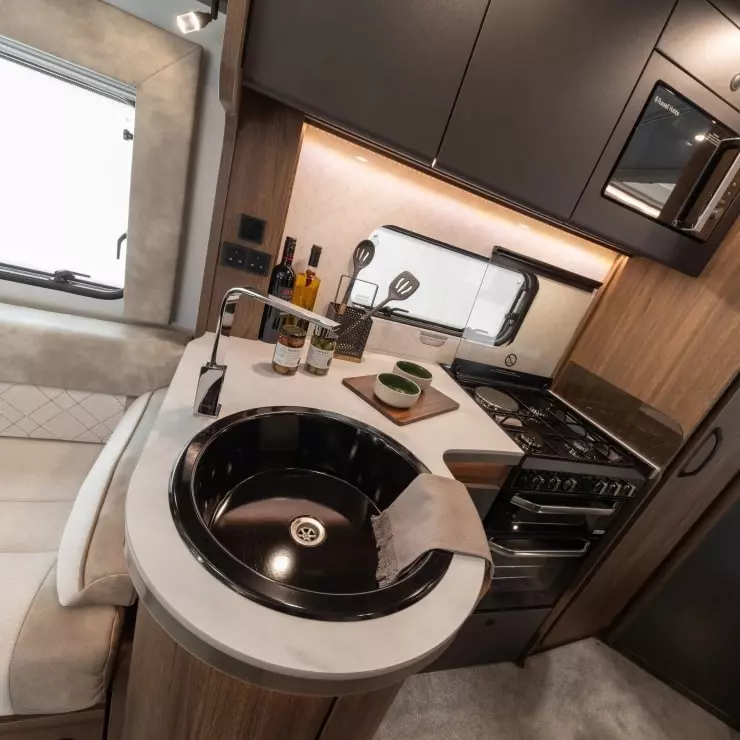 Khu bếp giữa xe tận dụng không gian hiệu quả và mang lại chức năng tuyệt vời. Nó có bồn rửa tròn kiểu dáng đẹp (hơi nhô ra lối đi trong trường hợp mẫu F-4F), bếp nấu Thetford sử dụng cả nhiên liệu và điện với lò nướng và vỉ nướng, lò vi sóng và tủ lạnh/tủ đông Dometic cao 177 lít với cửa hai cánh mở ra hai bên để dễ dàng sử dụng. Tủ dưới và tủ trên cung cấp nhiều không gian lưu trữ, trong khi tấm ốp tường có đèn nền làm sáng không gian.