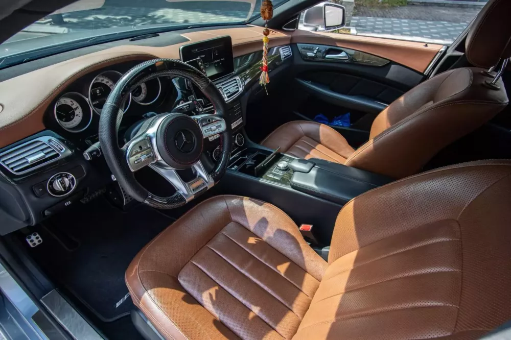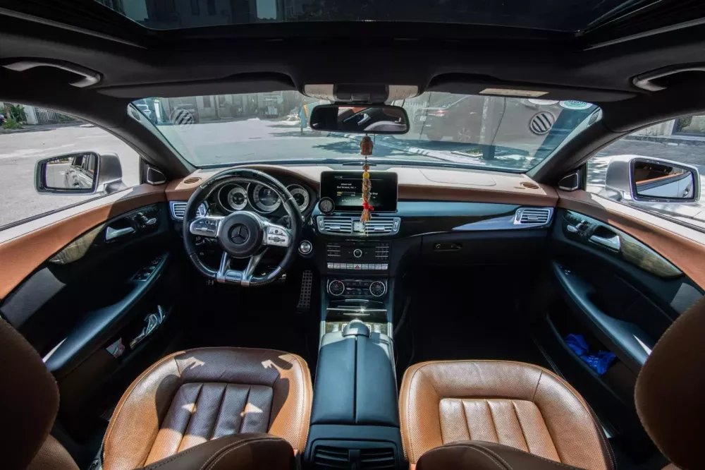 Các trang bị tiện nghi có trong khoang lái xe bao gồm màn hình trung tâm kích thước lớn, có đầy đủ kết nối USB, AUX, Bluetooth. Hệ thống âm thanh trên Mercedes-Benz CLS 500 đến từ Bang & Olufsen với 14 loa có công suất 1.400 watt, nhưng chiếc xe trong bài sử dụng hệ thống âm thanh của Harman Kardon. LED viền 64 màu