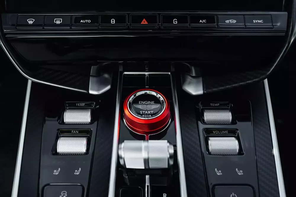 Các chi tiết bằng sợi carbon màu đen bóng tạo điểm nhấn tương phản, đường chỉ khâu màu xanh nhạt, trên tựa đầu và bậc cửa có hình dạng sóng trừu tượng, và logo cánh chim Aston Martin được thêu trên phần đệm vai hoàn thiện vẻ ngoài độc đáo của nội thất. Điểm nhấn màu đỏ có thể được nhìn thấy trên núm xoay khởi động/dừng.