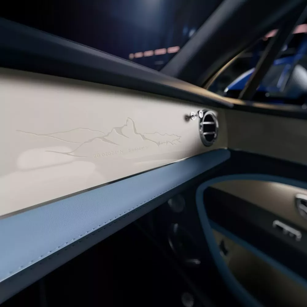 Ngoài ra còn có các chi tiết mạ crôm sáng bóng phía dưới cùng màu thân xe với tám sắc thái khác nhau, và cũng có tám màu sắc, tất cả đều hài hòa với sự kết hợp ba màu bên trong nội thất, một tùy chọn trước đây chỉ có trên mẫu Mulliner EWB. Ở phía trước, địa hình núi non hiểm trở xung quanh làng Artenara trên đảo Gran Canaria được khắc họa cùng với kinh độ và vĩ độ chính xác của Roque Bentayga.