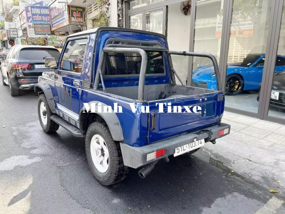 Chiếc xe Suzuki Samurai này có màu xanh cùng với đó là nội thất được thay ghế kiểu xe đua, da Alcantara, vô lăng cũng thế. Ngoại hình xe đã được độ lại hệ thống chiếu sáng đèn LED, cản trước thêm 2 bi LED cùng với đó là tời kéo xe. Chưa hết, cản va trước cũng đã thay mới, trông khá hiếu chiến. Bộ mâm của xe sơn màu trắng.