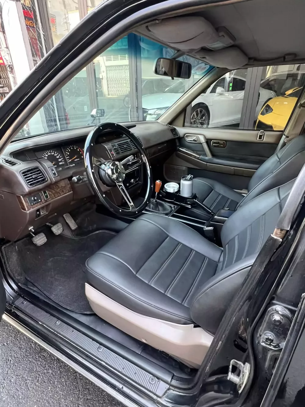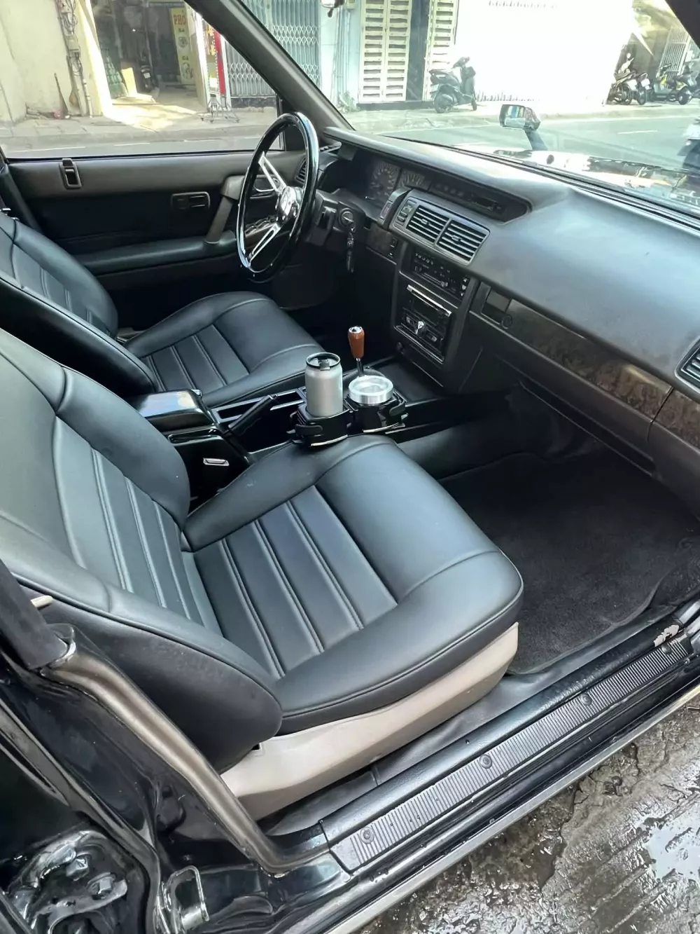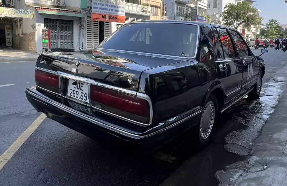 Ngoại thất xe Nissan Cedric này có màu đen, các chi tiết đều ở tình trạng nguyên bản nhất có thể, bao gồm cặp gương trên nắp capô, đèn pha, đèn hậu, mâm và tất nhiên còn nội thất, xe có điểm sáng chính là logo UN đã dán màu nổi trên nền sơn đen, trước đây đều được dán màu đen, ít thấy, nội thất xe độ thêm 2 bảo bối bất ly thân của chủ xe, hộp đựng cà phê và gạt tàn xì gà.