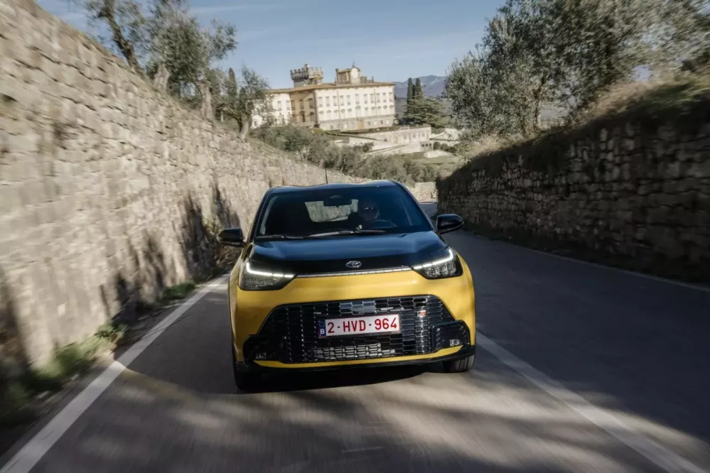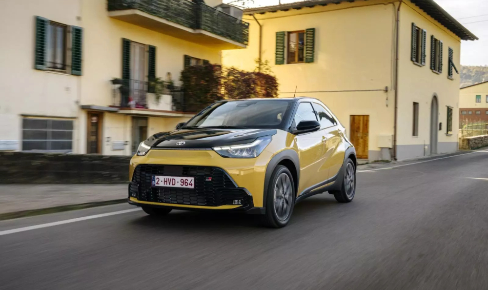 Toyota Aygo X GR Sport dễ dàng nhận biết nhờ phối màu hai tông vàng mù tạt và đen độc quyền, cùng lưới tản nhiệt dạng lưới và mâm hợp kim 18 inch.