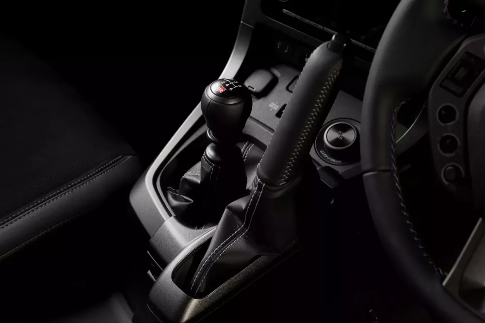 Mở cửa chiếc xe hatchback thể thao hợp pháp trên đường phố này, bạn sẽ thấy cần phanh tay bọc da dạng dọc với đường chỉ khâu màu xám, cũng như vô lăng GR với dây ba màu.