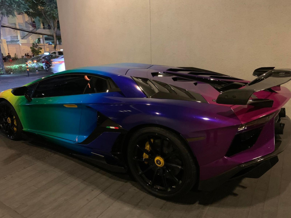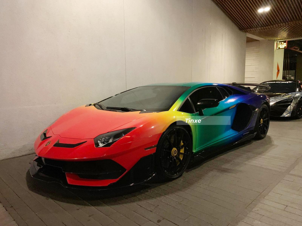 Giá lăn bánh xe Lamborghini Aventador SVJ với màu 7 sắc cầu vồng được dán bằng đề-can không được tiết lộ, chỉ biết rằng, tại thị trường nước ngoài xe có giá hơn 12 tỷ đồng và đã qua vài đời chủ tại dải đất hình chữ S này.