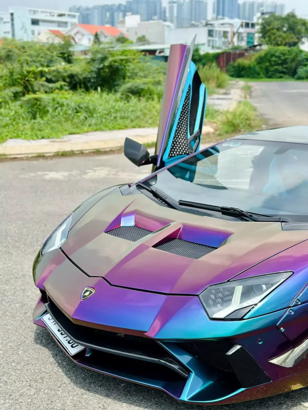 Về ngoại thất, chiếc siêu xe Lamborghini Aventador LP700-4 mang gói độ Liberty Walk này được dán bộ áo tán sắc, có thể thay đổi theo góc nhìn, với 2 màu chủ đạo là tím và xanh. Khá thời trang, và gần đây, cũng có 1 siêu xe mang bộ áo độc đáo này, với chi phí hơn 1,2 tỷ đồng đã được nhập khẩu chính hãng, đó là chiếc siêu xe McLaren 750S đầu tiên ở Việt Nam.