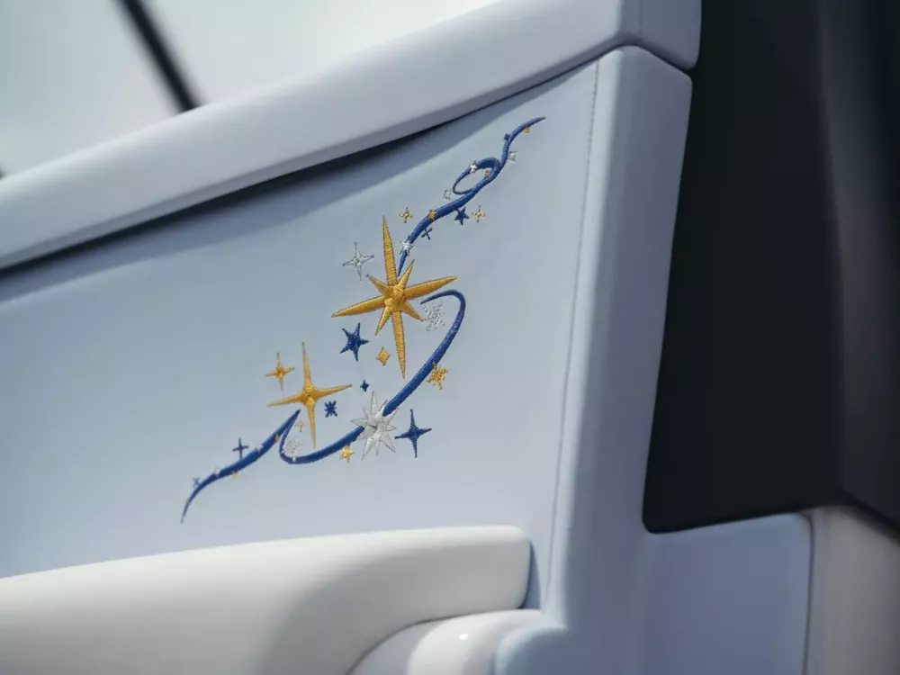 Sau khi hoàn thành việc sơn, các lỗ đục sợi quang được lắp đặt thủ công, tạo nên trần xe ánh sao ngoạn mục, được bổ sung bởi họa tiết cụm sao độc đáo trên tấm ốp cửa và tựa đầu dưới dạng thêu theo yêu cầu và trên bảng điều khiển phía trước hành khách dưới dạng tác phẩm nghệ thuật vẽ tay.